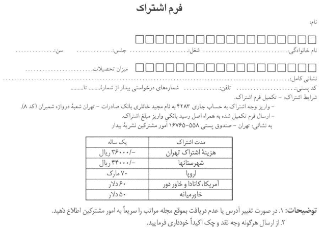 براي عضو شدن در قسمت مشتركين مجله لطفا از فرم زير پرينت گرفته آن را تكميل فرماييد و سپس به آدرس مندرج در فرم ارسال نماييد